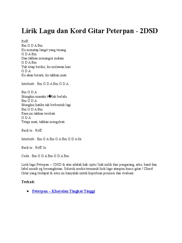 Lirik dan kunci gitar lagu peterpan. A d pernahkah engkau coba mengerti e a lihatlah ku disini a d mungkinkah jika aku bermimpi e a salahkah tuk menanti intro a g f e a g f e. Saya seringkali menyanyikan lagu lagu peterpan dikala waktu senggang.