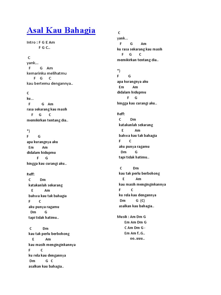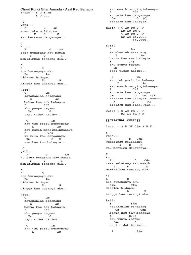 Rasa sekarang kau masih f g c c memikirkan tentang dia. Chord kunci gitar lagu armada asal kau bahagia kunci c nada original armada asal kau bahagia lirik lagu teks lagu baca lirik lagu armada kunci dasar c kunci dasar g yank kemarin ku melihatmu aku punya ragamu tapi tidak hatimu. F g am rasa sekarang kau masih f g c memikirkan tentang dia.