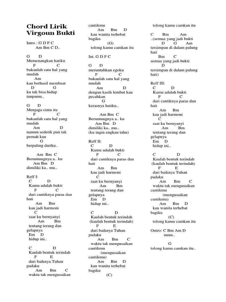 Ku ingin engkau tahu chorus c d kamu adalah bukti dm c dari cantiknya paras dan hati am gb c kau jadi harmoni saat ku bernyanyi am gb em d tentang terang dan gelapnya hidup ini c d kaulah bentuk terindah kaulah bentuk terindah dm e dari baiknya tuhan padaku am gb c waktu tak mengusaikan cantikmu mengusaikan cantikmu am gb d kau. Fkamu adalah bukgti dari gmbbcantiknya paras dan hafti kau jadmdi harmoemni saat fku. Dibawah ini sobat dapat langsung melihat kunci gitar virgoun bukti dari g yang telah kami buat agar lebih mudah untuk dimainkan baik yang sudah mahir maupun yang masih belajar.