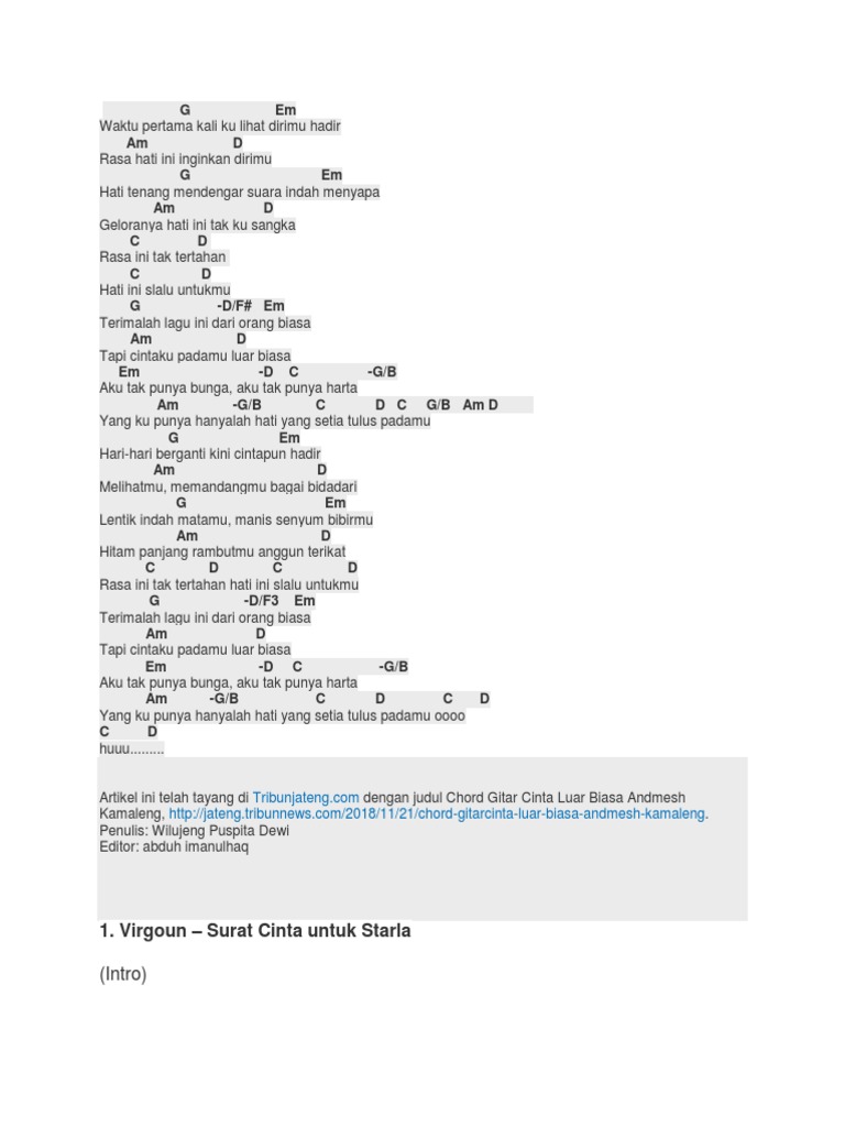 Chord kunci gitar cinta luar biasa andmesh kamaleng chord gitar cinta luar biasa g em am d g em am d c d waktu pertama kali ku lihat dirimu hadir rasa hati ini inginkan dirimu rabu 21 november 2018 1013. Ku mau dia tak mau yang lain hanya dia yang selalu ada kala susah dan senangku. Arya nara 3869776 views.