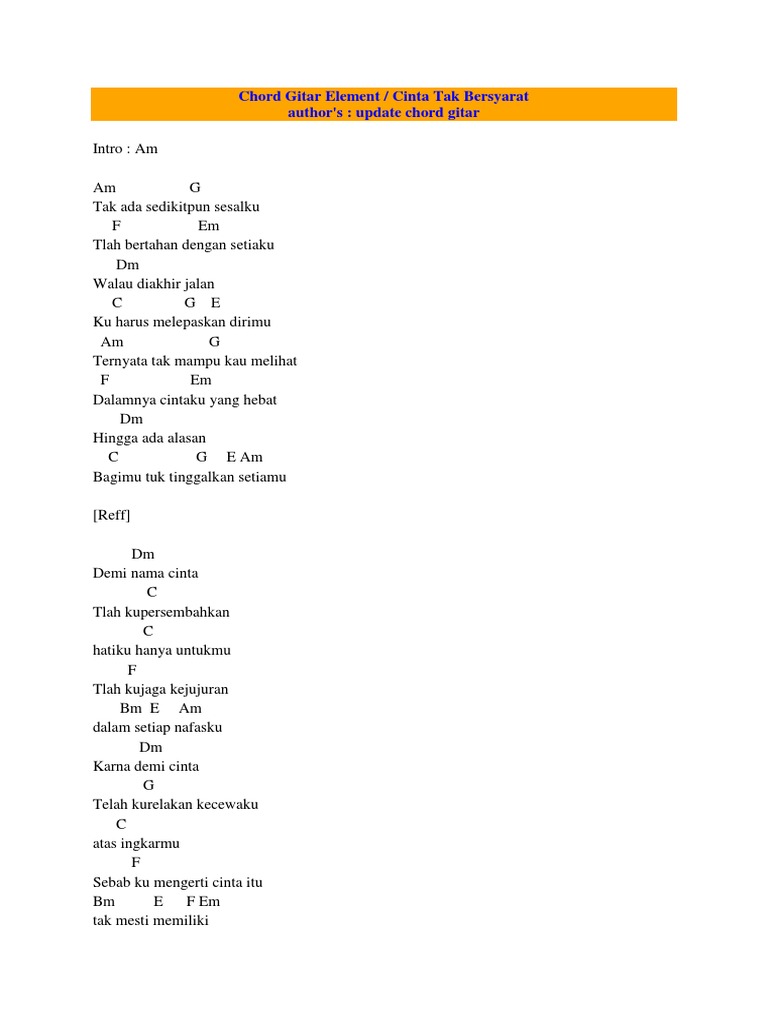 Check the best collection of Kunci gitar lagu cinta sejati element for desktop, laptop, tablet and mobile device. You can download them free. Cinta Tak Bersyarat