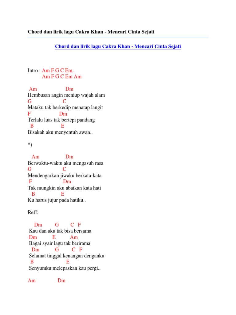 Check the best collection of Kunci gitar lagu cinta sejati for desktop, laptop, tablet and mobile device. You can download them free. Chord Dan Lirik Lagu Cakra Khan Mencari Cinta Sejati