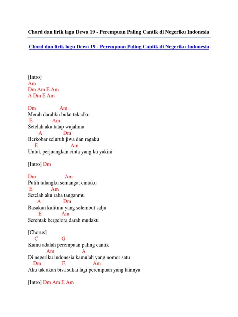 Check the best collection of Kunci gitar lagu dewa for desktop, laptop, tablet and mobile device. You can download them free. Chord Dan Lirik Lagu Dewa 19 Perempuan Paling Cantik Di