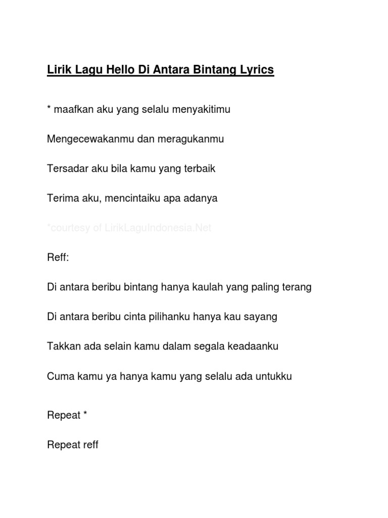 Hello diantara bintang cover akustik cover lagu indonesia live dari hello diantara bintang cover akustik silvia nicky ft. Di antara beribu bintang hanya kaulah yang paling terang di antara beribu cinta pilihanku hanya kau sayang takkan ada selain kamu dalam segala keadaanku cuma kamu ya hanya kamu yang selalu ada untukku maafkan aku yang selalu menyakitimu mengecewakanmu dan meragukanmu tersadar aku bila kamu yang terbaik terima aku mencintaiku apa adanya. C g am em di antara beribu bintang hanya kaulah yang paling terang f c dm g di antara beribu cinta pilihanku hanya kau.