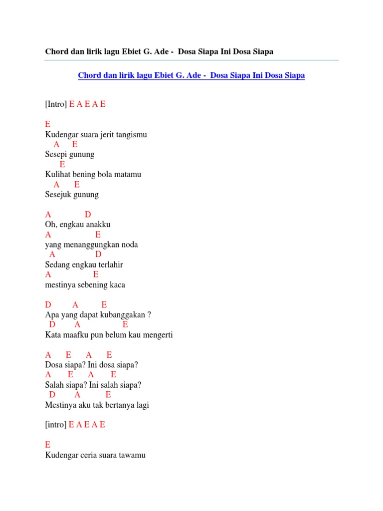Check the best collection of Kunci gitar lagu ebiet g for desktop, laptop, tablet and mobile device. You can download them free. Chord Dan Lirik Lagu Ebiet G Ade Dosa Siapa Ini Dosa Siapa