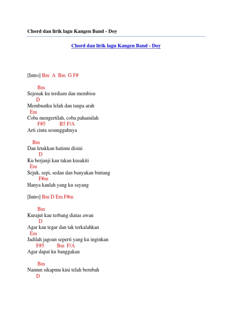 Kunci gitar lagu kangen band doy. Kunci gitar tab dasar mudah c g am em f c dm g lengkap dengan alat transpose. Chord kangen band doy intro bm a bm g f bm sejenak ku terdiam dan membisu d membuatku lelah dan tanpa arah em coba mengertilah coba pahamilah f bm arti cinta sesungguhnya bm dan letakkan hatimu disini d ku berjanji kau tak kan kusakiti em sejuk sepi sedang dan tanyakan bintang f bm hanya kaulah yang ku sayang intro bm d em f bm ku latih kau terbang diatas awan d agar kau tegar dan tak. Apa kabarmu am em ku harap.