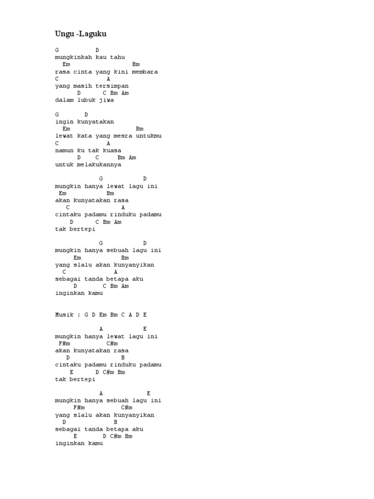 G d mungkinkah kau tahu em bm rasa cinta yang kini membara c a yang masih tersimpan d c bm am dalam lubuk jiwa g d ingin kunyatakan em bm lewat kata yang mesra untukmu c a namun ku tak kuasa d c bm am untuk melakukannya. Lirik lagu kunci gitar chord ungu laguku intro g d em bm c a d c bm am g d mungkinkah kau tahu em bm rasa cinta yang kini membara c a yang masih tersimpan d c bm am dalam lubuk jiwa g d ingin kunyatakan em bm lewat kata yang mesra untukmu c a namun ku tak kuasa d c bm untuk melakukannya. Lirik kunci gitar chords gitar kord gitar ungu laguku.