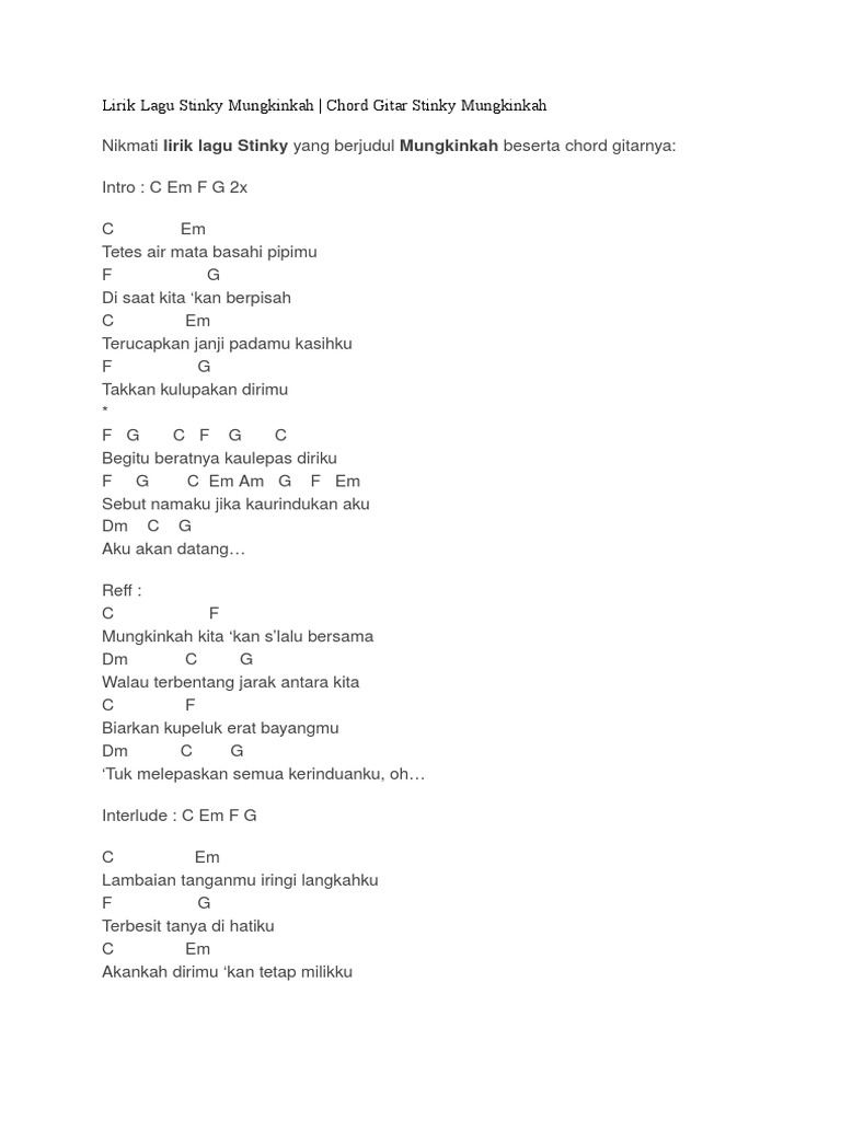 C em terucapkan janjipadamu kasihku f df g takkan. Kunci lirik chordskord gitar lagu dangdut rohani dan lagu kenangan. Chord gitar lagu kunci gitar lagu stinky mungkinkah 316804 intro c em f g 2x c em tetes air mata basahi pipimu f g di saat kita kan berpisah c em terucapkan janji padamu kasihku f g takkan kulupakan dirimu f g c f g c begitu beratnya kaulepas diriku.