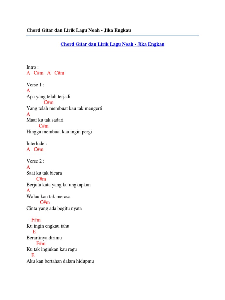Inilah chord kunci gitar dan lirik lagu jika engkau. Chord gitar lagu kunci gitar lagu noah jika engkau 39704 intro a cm a cm a apa yang telah terjadi cm yang telah membuat kau tak mengerti a maaf ku tak sadari cm hingga membuat kau ingin pergi int a cm a saat ku tak bicara cm berjuta kata yang ku ungkapkan a. Intro a cm a cm a apa yang telah terjadi cm yang telah membuat kau tak mengerti a maaf ku tak sadari cm hingga membuat kau ingin pergi int a cm a saat ku tak bicara cm berjuta kata yang ku ungkapkan a walau kau tak merasa cm cinta yang ada begitu nyata fm e ku ingin engkau tahu berartinya dirimu fm e ku tak inginkan kau ragu aku kan bertahan dalam hidupmu chorus a jika engkau.